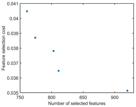 As the next step, the NSGA II was used to define the input set of the classifiers. The output of this algorithm is not only one set of inputs. NSGA II provides non-dominated results in its Pareto-front which, all of them can be used based on the computational power and the desired accuracy. The Pareto-front of the NSGA II in current work, is shown in Figure 8, which describes the feature selection cost for the solutions provided by the NSGA II. An MLPNN was used as the cost function of the algorithm. The deviation from the joint center-line was set to 0.9 mm, as according to Table 1, the best accuracy is obtained using a deviation of 0.9 mm. All data was divided randomly to training and testing data sets, in each iteration for each individual. Cost was set to median accuracy of 10 runs for testing the data set.