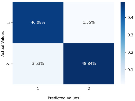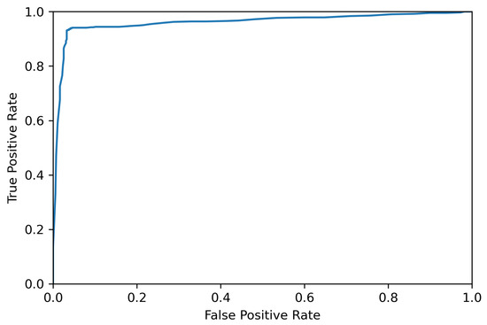 According to Table 2 and Table 3, not all wavelengths are needed to be used as the inputs of the classifiers and the selected set of the wavelengths provides the same or slightly higher accuracy for the selected testing data set. The corresponding receiver operating characteristic curve (ROC) and confusion matrix for RF using 920 selected wavelengths for detecting a deviation of 0.9 mm are presented in Figure 9 and Figure 10, respectively.