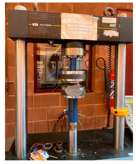 To validate the POF sensor’s response to loading and unloading, stationary and dynamic tests, checking the sensitivity and measuring range, a universal compression machine (Instron 8516) was used to perform various load tests. The data were collected at a rate of 1 kHz. Figure 2 shows a photo of the load testing platform with the EVA insole, and a piece of the same material which was placed on top of the sensor to protect it.