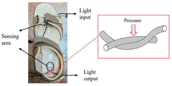 POF sensors positioned in a sandal for in-shoe measurements of plantar pressure with a zoom of intersection part of the fiber.
