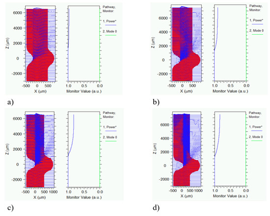 The transmitted optical power with varying bending diameters simulated by Beam-PROP: (a) 3.9 mm, (b) 3 mm, (c) 2.5 mm, (d) 2 mm.