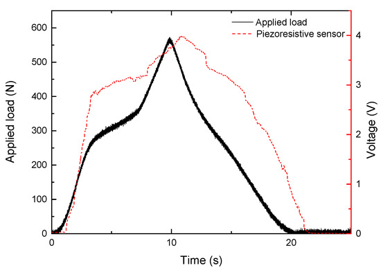 First, the behavior of a commercial piezoresistive sensor was investigated by applying a load and unload ramp from 0 to 500 N in steps of 100 N using the compression machine. Figure 6 illustrates the graph of applied load and the sensor’s response. According to these results, the resistive sensor can detect the overall shape of the applied load; nevertheless, this sensor lacks good repeatability, as the response varied by up to ±1.5 V when we repeated the test. Furthermore, according to the datasheet, this resistive sensor can only detect applied weights up to 50 kg (approximately 500 N).