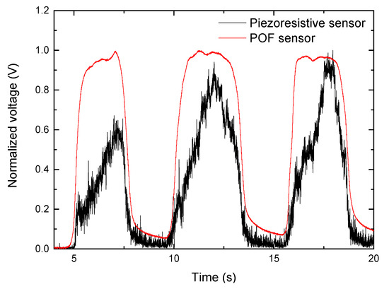 Then, simultaneous tests with the piezoresistive sensor were carried out to validate the POF sensor. Both sensors were placed in the insole’s heel section, and their responses were compared. Three repetitions were performed during the measurements, with the woman participant standing on the insole for about 4 s and then moving back for 2 s. Figure 7 presents the results for both sensors and it shows that the loading and unloading points are in the same positions in the time axis; however, the POF sensor exhibits higher stability and repeatability, as well as less noise in the response. This could also validate the POF sensor’s response value, as the maximum normalized voltage levels in the second and third tests are nearly identical in both sensors. Furthermore, the POF sensor initial condition is not fully recovered after 2 s as a residual voltage is present after unloading.