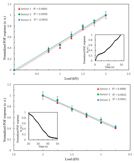 Applied load and normalized POF sensor response for a load and unload ramp of 2 kN with 10 N step for three different sensors.
