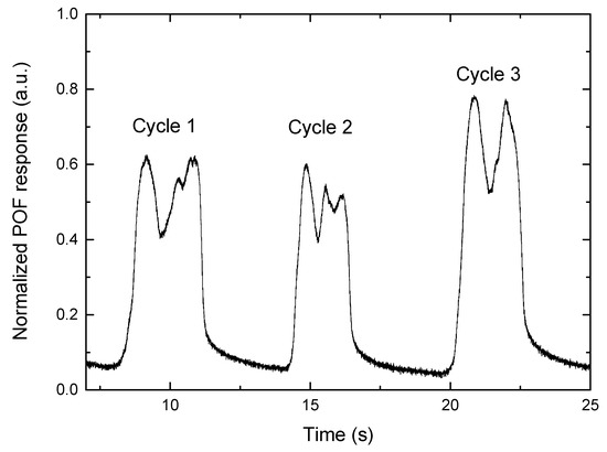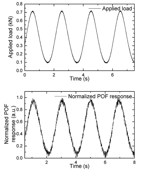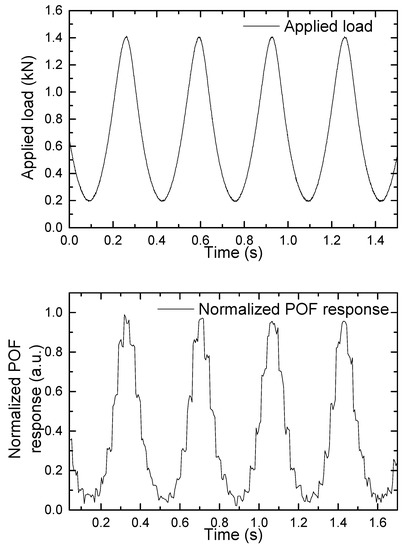 Afterward, cyclic tests were carried out in order to simulate walking and running patterns while minimizing the effects of temperature changes, speed inconsistency, posture changes, and other factors that occur during human gait. Figure 10 and Figure 11 show the applied load and associated normalized POF response that simulates walking and running patterns, respectively.