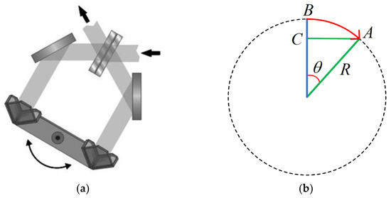For the double moving mirror torsion pendulum optical structure, shown in Figure 3a, the change in the OPD can be simplified as shown in Figure 3b [29]. Assuming point B is the starting center position of the swing arm, and swinging the swing arm radians to point A, the OPD generated by this motion can be regarded as AC, that is, . At the same time, according to the optical-path design in Figure 3, the light needs to enter and exit the angled mirror twice, and both sides of the swing arm are symmetrical. With the rotation of the swing arm, the OPD of the whole interference system changes as follows: