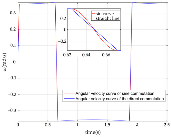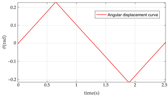According to the performance parameters in Table 1, the relationship between the angular speed and the time of the RT VCM finally determined is shown in the red curve in Figure 5, in which the blue curve represents the angular speed without sinusoidal commutation. The relationship between the angular displacement and the time corresponding to the angular velocity is shown in Figure 6.