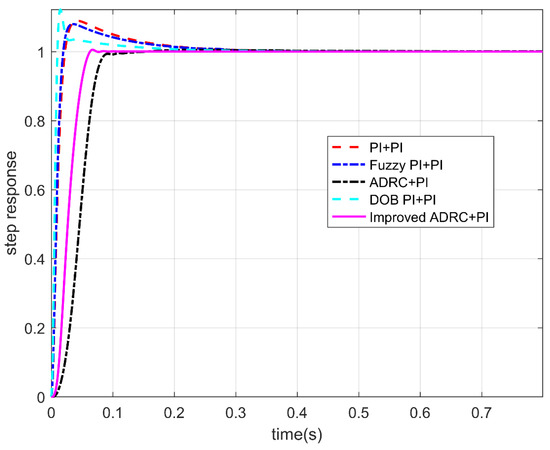 The step responses of the five controllers when the controller input is a step signal are shown in Figure 9, and the step response indexes are shown in Table 3. According to Figure 9 and Table 3, it can be concluded that when the input is a step signal, the classical PI double closed-loop controller, the fuzzy PI double closed-loop controller, and the PI double closed-loop controller based on DOB have a large overshoot. The overshoot of the conventional active disturbance rejection double closed-loop controller and the IADR-DCLC is almost zero. Compared to the conventional active disturbance rejection double closed-loop controller, the IADR-DCLC causes the system to enter the steady state faster. In addition, the final steady-state error of the IADR-DCLC is 0%. The IADR-DCLC shows excellent dynamic performance and steady-state performance.