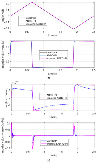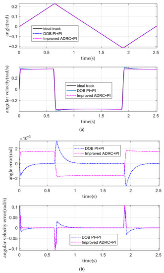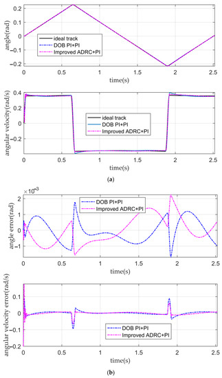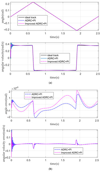 The tracking curves and error curves. (a) The angular displacement tracking curves and the angular velocity tracking curves of the conventional active disturbance rejection double closed-loop controller and the IADR-DCLC; (b) the angular displacement error curves and angular velocity error curves of the conventional active disturbance rejection double closed-loop controller and the IADR-DCLC.