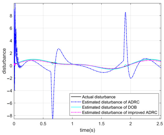The curves in Figure 15 are the disturbance curves observed by the three controllers. It can be seen that among the three controllers that the disturbance observed by the conventional active disturbance rejection double closed-loop controller is the worst; especially in the initial and commutation stages of the RT VCM, the error of disturbance is large, which seriously affects the performance of the controller. The disturbance observed by the PI double closed-loop controller based on DOB is also affected by the commutation of the RT VCM, and there is a certain error that affects the smooth operation of the RT VCM. The disturbance observed by the IADR-DCLC is very close to the disturbance added to the system and is not affected by the commutation of the RT VCM.