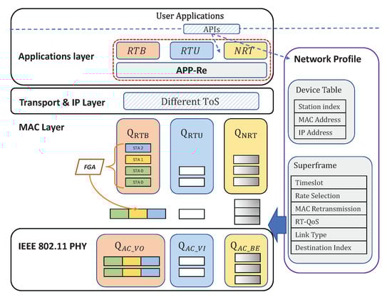 The network file is a static file to control the transmission pattern and to maintain the network information, including a device table and a superframe structure maintained by the access point (AP) and all stations. The device table contains the MAC address, IP address, and a unique index of each station. The TDMA-based communication pattern is established by a superframe structure, which defines the transmission behaviors in a sequence of consecutive time slots. In RT-WiFiQA, each transmission in the superframe is configured with a link type (i.e., downlink or uplink), an index of the targeted destination, a transmission rate, MAC-layer retransmission times, and an RT-QoS indicator. The maximum MAC-layer retransmission times can be evaluated through the transmission rate, allocated time slots, and packet lengths. The network profile plays the role of the bridge between the APP layer and the MAC layer and can be generated through our APIs. The scheduler on the MAC layer follows the superframe structure to transmit packets with transmission rates and retransmission times.
