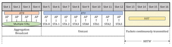 Figure 2 is an example of the superframe structure. There is an RT-QoS indicator defined for each time slot to determine the packet selection from different queues. The first four time slots are used for RTB packets, which can be transmitted through multiple time slots because of the FGA mechanism. Slots 5 to 12 are reserved for RTU packets, including both uplink and downlink. NRTW for NRT packets is from the 13th slot to the last. In the NRTW, we adopt a best-effort transmission scheme to transmit as many packets as we can under the constraint that the packet transmissions do not exceed the NRTW. In the best-effort scheme, we first fetch a packet from the NRT queue and estimate its transmission duration according to its packet length, transmission rate, and retransmission times. The transmitter can reserve the duration for each packet and trigger the next transmission after this duration time. This process keeps executing until the end of the NRTW.