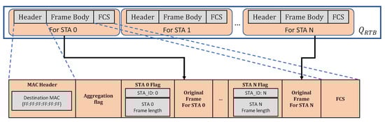 After the selection of FGA packets, the scheduler will initially push these packets into a temporal singly linked list. The first frame in the linked list will keep slices of the MAC header and frame check sequence (FCS). A one-byte hexadecimal aggregation flag is appended after the MAC header for recognition of the aggregated packet. Then, a unique station flag will be generated for each frame, including the station identity recorded in the device table and a frame length. The scheduler further appends the combinations of one station flag and its corresponding full original frame after the aggregation flag. Finally, the destination address at the MAC header of the aggregated frame is changed to the broadcast MAC address, e.g., 0xFF. An example of the final aggregated frame format is shown in Figure 3.