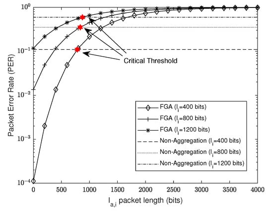 PER against aggregated packet size for different , where the critical thresholds can be evaluated based on Proposition 1.