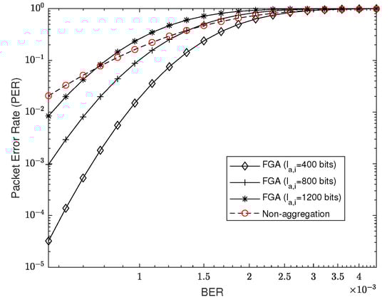 We then show the PER against different BER p in Figure 5 and set as 800 bits. In Figure 5, we can first observe that the PER curves grow as BER increases. If the BER is relatively low, the FGA scheme can achieve a lower PER compared with the non-aggregation scheme for a large variety of . Otherwise, the FGA scheme can achieve a lower PER only for a small . This observation indicates that packets with a large size can be aggregated when the channel condition has a mild BER. It is because a good channel condition can achieve a low PER even when the packet size is large.