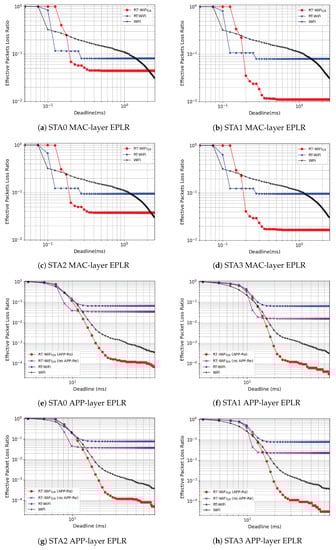 We define the deadline as the required latency performance of a given application, and the effective packet loss ratio (EPLR) as the percentage of packets unsuccessfully received at or exceeding the given deadline. We use complementary cumulative distribution function (CCDF) curves in Figure 7 to present the EPLR performance of all the stations, which can indicate the trade-off between latency and reliability. We first plot the MAC-layer EPLR performance in Figure 7a–d. The curves of RT-WiFi and WiFi drop earlier than RT-WiFiQA, illustrating that the minimum achievable delay of RT-WiFi and WiFi is lower than RT-WiFiQA. It is because the proposed FGA mechanism leads to a larger packet size such that the FGA packets cannot be transmitted within an extremely small amount of time. The downward tendency of RT-WiFiQA and RT-WiFi is concentrated upon the mean delay and follow a step case. Differently, the curve of WiFi shows a gradual downward trend. It is because the WiFi system uses a dynamic rate control algorithm, i.e., Minstrel [30], but RT-WiFi and RT-WiFiQA choose a fixed rate and retransmission times setting. This observation also presents the proposed RT-WiFiQA and RT-WiFi can guarantee bounded latency. Moreover, RT-WiFiQA achieves lower EPLR than RT-WiFi. It is because the proposed FGA scheme can potentially increase the reliability of the system by reducing the transmission overhead and allow for more retransmission times. Lastly, WiFi can outperform RT-WiFi and RT-WiFiQA when the delay requirement is very high, e.g., more than 2 ms for STA0. It is because WiFi uses the CSMA/CA scheme and has a larger number of retransmissions. Differently, RT-WiFi and RT-WiFiQA apply limited retransmission times in order to achieve bounded latency.