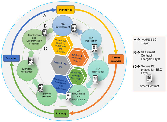 The proposed self-adaptive security RE_BBC process aims to achieve a comprehensive understanding of the security vulnerabilities and risks in SLA-based SC for BBC systems and generate a quality set of self-adaptive security requirements for a relevant SLA-based SC that is adequate for building call integrity, atomicity, and policy compliance in BBC systems [13]. The proposed secure RE process for SLA-based SC is based on the MAPE-BBC adaptation loop, shown in Figure 1. It can be described in four phases of the SRE_BBC process according to the corresponding MAPE phases: phase 1, Secure SLA-based SC monitoring, and elicitation (monitoring). Phase 2, SLA-based SC threat analysis (threat analysis). Phase 3, Secure SLA-based SC specification for BBC (planning). Phase 4, SLA-based SC assessment and validation (execution).