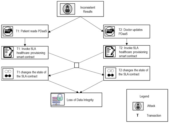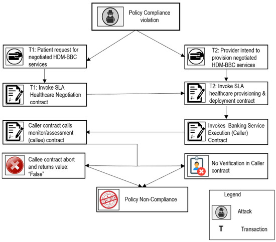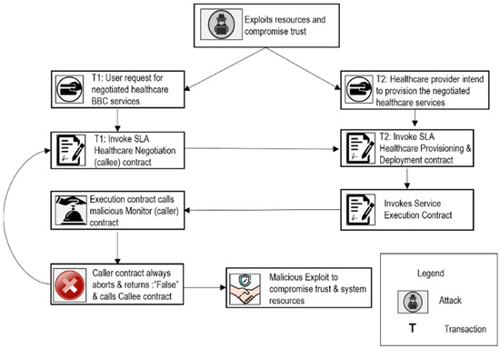 Dr. Lee initializes transaction T1 to update Mr. Kim’s EHR data and invokes the SLA healthcare provisioning and deployment contract. Mr. Kim initializes transaction T2 to read Mr. Kim’s EHR data and invokes the SLA healthcare provisioning and deployment contract concurrently. As T1and T2 invoke the SLA healthcare provisioning and deployment smart contract concurrently, there can be a ToD vulnerability that can violate the integrity of the EHR data. The current log of transactions in a block is monitored to identify whether a ToD or timestamp vulnerability occurs using transaction check agents and threat models. If there is a ToD vulnerability, then sharing expulsion will be executed as a guard condition. If there is a timestamp vulnerability, then as an adapted plan, block numbers are assigned as random numbers. The monitor phase alerts the system if there is a mishandled exception by monitoring the call logs and checking the return value (true/false) of the callee contract through the contract call agent. If a contract fails, the contract call agent outputs through the negotiator agent that the negotiated SLAs are not provisioned. In this case, the contract will be blocked and output as a “Malicious Contract”. In this case, the adapted plan will be executed, in which the malicious contract will be replaced with a non-malicious monitor/assessment contract. If the monitor phase identifies a reentrancy vulnerability, the contract call agent checks the return value (true/false) of the callee contract and rollback. If the return value is false, then the adapted plan is executed by replacing the aborting contract with a non-aborting monitor/assessment contract.