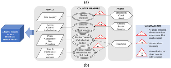 Figure 4b depicts the adaptive security goal model for SLA SC. Policy compliance, call integrity, and atomicity are considered as security goals; subsequently, four countermeasures are designed in the BBC system to accomplish these goals. Four vulnerabilities are identified in the SLA SC use cases as depicted in Figure 4a. Three agents are assigned to provide the countermeasures and take necessary actions to fulfill the goals.