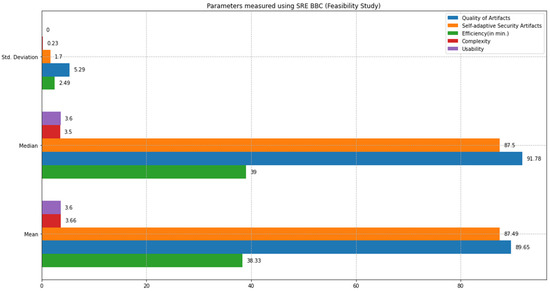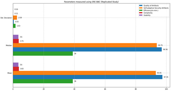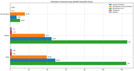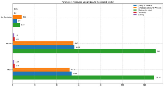 Similar to the feasibility study results, the replicated study results indicate that the proposed approach can address self-adaptive security more quickly than the SQUARE approach. The final complexity level score for the SQUARE approach, and the proposed approach, as stated in Table 5, are calculated by averaging the complexity level scores of group 2 SMEs and SMEs 4, 5, and 6 for the SQUARE approach and group 1 SMEs, SME 1, 2, and 3 for the proposed SRE_BBC approach. SMEs used a four-level score for rating complexity that ranged between levels 1: very complex, 2: complex, 3: simple, and 4: very simple.