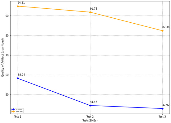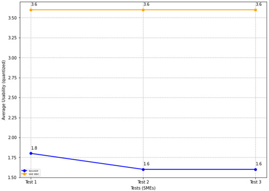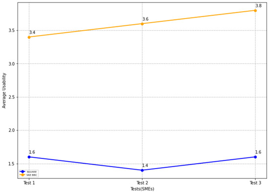 In Figure 23, the blue and yellow lines compare the average usability level score for the SQUARE approach and the proposed SRE_BBC approach. As we can see in Figure 23, SMEs gave better performance for test 1 (1.6 vs. 3.4 mean), test 2 (1.4 vs. 3.6 mean), and test 3 (1.6 vs. 3.8 mean) when they used our proposed approach relative to SQUARE approach in terms of usability level score for HDM system.