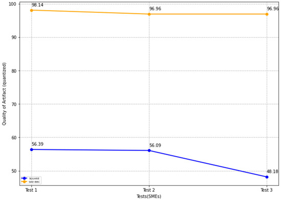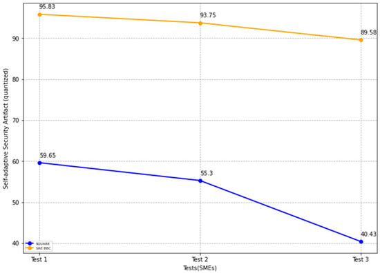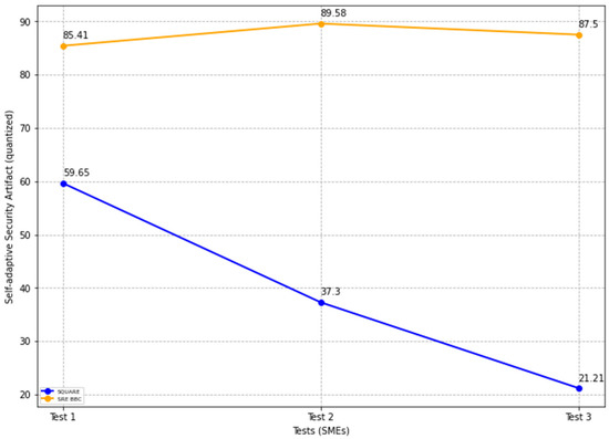 In Figure 21, the blue and yellow lines show the average value of self-adaptive security evaluation quality for the SQUARE approach and the proposed SRE_BBC approach, respectively. From Figure 21, SMEs gave better performance for test 1 (59.65 vs. 95.83 mean), test 2 (55.3 vs. 93.75 mean), and test 3 (40.43 vs. 89.58 mean) when they used our proposed approach relative to the SQUARE approach in terms of self-adaptive security evaluation quality for HDM system.