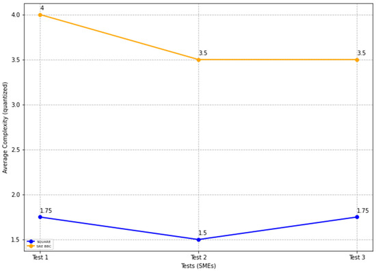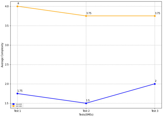 In Figure 22, the blue and yellow lines compare the average complexity level score for the SQUARE approach and the proposed SRE_BBC approach. As we can see in Figure 22, SMEs gave better performance for test 1 (1.75 vs. 4 mean), test 2 (1.5 vs. 3.75 mean), and test 3 (2 vs. 3.75 mean) when they used our proposed approach relative to the SQUARE approach in terms of complexity level score for HDM system.