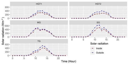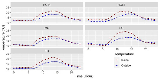 Figure 1 shows the average temperature of all sensors on an hourly scale inside the greenhouse and the hourly average value of the outside sensor. In general terms, the typical behavior of this type of structure in tropical climates is observed for all the greenhouses evaluated, with the lowest temperature conditions occurring at night and the highest between noon and 15:00 hours, just after the moments of maximum external solar radiation [23]. The mean temperature (Tm) values for the 24 h inside the greenhouses were 15.1 ± 3.6, 14.0 ± 3.5, 15.9 ± 5.1, 15.7 ± 3.5 and 15.9 ± 3.1 °C for TG, MG, SG, HGT1 and HGT2, respectively, which are 2.0, 0.9, 1.6, 1.4 and 1.8 °C higher than the outside ambient conditions for each of these greenhouses.