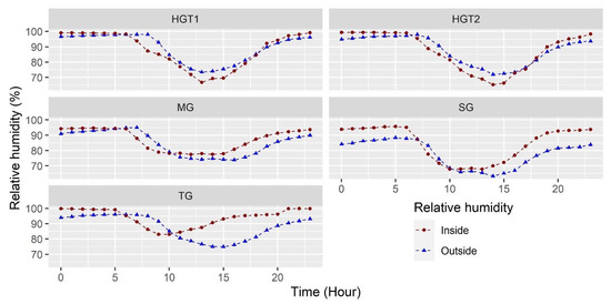 The RH value for the 24 h of the day was 93 ± 6%, 87 ± 7%, 84 ± 11%, 88 ± 11% and 87 ± 12% inside TG, MG, SG, HGT1 and HGT2, respectively, values differing by 6%, 2%, 6%, –1.4% and –0.5% with respect to the outside environment for each greenhouse. Therefore, it is evident that for TG, MG and SG, the RH conditions are higher than the outdoor environment, and the RH values inside the greenhouses are above the RH values recommended for crops under cover, which range between 60 and 80% [39]. These conditions of high humidity inside the greenhouses generate a favorable environment for ornamental or horticultural species to be infested and affected by pathogens that generate fungal diseases, which have a high capacity to cause damage to plants. Therefore, productive losses and environmental damage associated with the application of chemical control substances for diseases, such as gray mold and downy mildew, caused by Botrytis cinérea and Chromista Peronospora sparsa, occur [40,41].