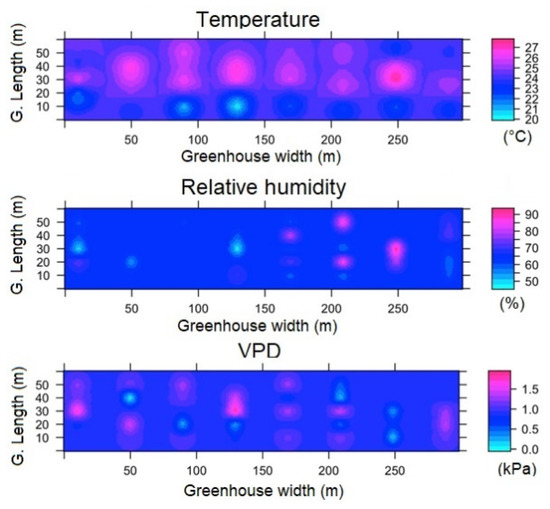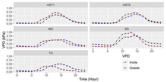 In the case of the minimum mean VPD values, these values were 0.001, 0.06, 0.05, 0.01 and 0.008 kPa for TG, MG, SG, HGT1 and HGT2, respectively. These values, so close to 0, generally occur during the entire night period and are quite inadequate for plant growth, generating a favorable environment for the appearance and survival of fungal diseases [45,46]. Therefore, it is necessary to analyze these situations and look for alternatives to improve the microclimate conditions related to VPD present in the greenhouses evaluated.