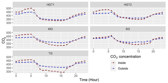 Finally, the concentration of carbon dioxide (CO2) is another microclimatic variable that directly affects the photosynthetic assimilation of plants and, therefore, is a variable that must be monitored inside greenhouses [49]. In the case of this study, it should be mentioned that the greenhouses studied do not have carbon enrichment systems, and there is no local information on the behavior of this variable in these types of greenhouses. Figure 5 shows the hourly trend of the CO2 concentration in each of the greenhouses, the mean values of CO2 concentration in the greenhouses were 381.4 ± 66.4, 396.2 ± 57.5, 391.7 ± 42.6, 397.7 ± 66.1 and 409.4 ± 48.9 ppm for TG, MG, SG, HGT1 and HGT2, respectively.