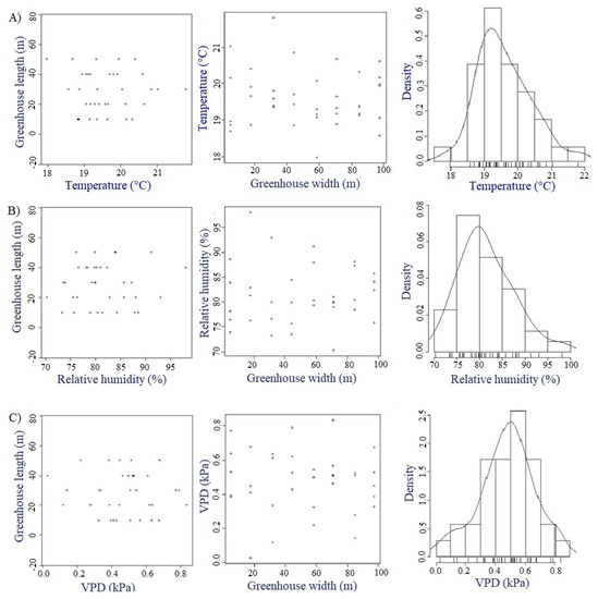 In order to rule out any kind of trend in the datasets collected and, additionally, to verify that these same datasets fit a normal distribution, the graphs shown in Figure 6 are constructed. In this case, trends can be observed for data collected in MG and ESRL 5 for temperature (Figure 6A), in ESRL 3 for relative humidity (Figure 6B) and in ESRL 4 for VPD (Figure 6C). These curves show that for both the width and length of the greenhouse, most of the values of the three variables analyzed are randomly distributed without any trend; the temperature ranges between 17.8 and 22.0 °C, the relative humidity between 70% and 96% and the VPD between 0.01 and 0.86 kPa.