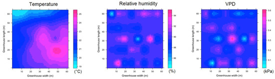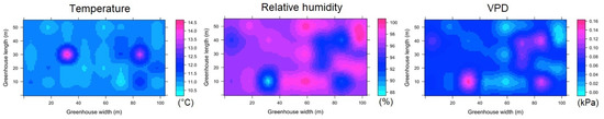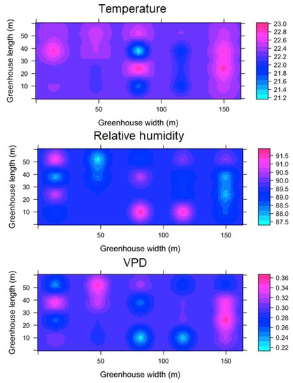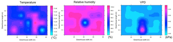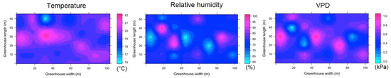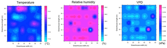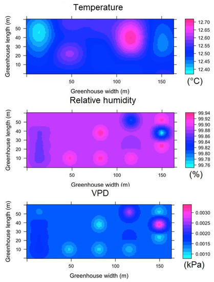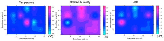 It is also possible to infer, in principle, that from the bell-shaped histograms of the three variables, there is an adjustment to the normality of the dataset. This was confirmed by calculating the Shapiro–Wilk test, where it is established that to guarantee the normality of the data, the p-value must be greater than the defined alpha (0.05), and for these datasets, p-values of 0.48, 0.39 and 0.33 were obtained for temperature, relative humidity and VPD, respectively. This normality of the datasets is always desirable in this type of work since it guarantees adequate predictions of the study variables by means of the kriging method [52]. This same procedure was performed for all 75 datasets collected in this study, obtaining the same satisfactory results as for the 3 datasets discussed above.