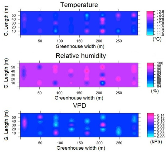 For the case of the aggregated data for the night hours (ESRL 1), it was found that for the MG greenhouse, the value of Tm was 11.1 ± 1.1 °C (Figure 7). It was observed that inside the greenhouse, the temperature in the largest amount of covered area ranges between 10.4 and 11.3 °C, while the maximum magnitude of the thermal differential inside the greenhouse (ΔTG) was 4.1 °C between small areas located in the central region and some points of the front sides. In the case of RH (Figure 7), the mean value was 93 ± 1.6 °C, with a very important area between values of 94% and 97%, while the maximum humidity differential (ΔRHG) was 11% between some perimeter points of MG. For the VPD variable, the mean value was 0.09 ± 0.03 kPa, while the VPD differential (ΔVPDG) was 0.16 kPa between areas located in the center and the perimeter of MG.