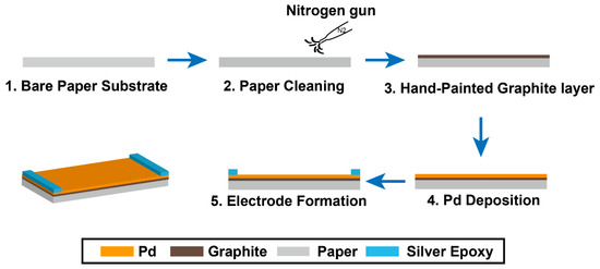 Schematic illustration of the fabrication steps of the palladium (Pd) microfiber network H2 sensor based on graphite-on-paper (GOP) substrate.