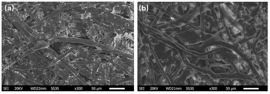 Scanning electron microscope (SEM) images of the surface of (a) the paper coated with graphite (GOP substrate), and (b) 8 nm Pd thin film deposited on the GOP substrate.