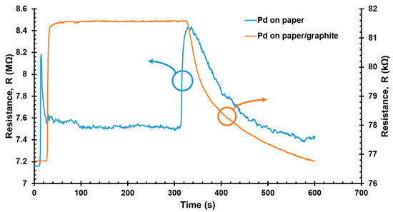 This curious response behavior has previously been reported for pure 7 nm Pd nanowire operating in N2 [9], it was difficult to determine the response time and gas response of the sensor on the basis of response curves like this. Although the thinner Pd film on roughness surface is able to provide a faster response and higher sensitivity, the unstable detection curve resulting from the discontinuities in the Pd microfiber is a critical issue that needs to be addressed. Therefore, an intermediate layer with high resistance and insensitivity to H2 was utilized to modify the interaction of Pd with the paper substrate, and to address the issue of discontinuity in the ultra-thin Pd film on the substrate. In this experimental study, graphite is proposed as an intermediate layer for the H2 sensor based on ultra-thin Pd film. As demonstrated in Figure 5, the sensor with 8 nm Pd on the GOP substrate exhibited smooth resistance changes, and an unsteady detection curve was not observed due to there being no discontinuous microfibers present. Hence, the low-cost and commonly available graphite can be regarded as a potential non-metallic intermediate layer for discontinuous ultra-thin Pd films on paper substrate.