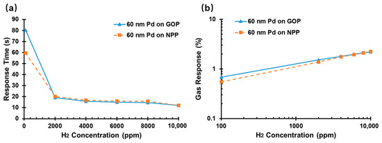 The response time and gas response are the two primary parameters for the evaluation of H2 sensors. Response time is defined as the time taken to achieve 90% of the total change in sensor resistance, and the gas response can be determined using Equation (1). To investigate whether the response time and gas response of the sensor are affected by the GOP substrate, the sensing performance of the sensor comprising Pd film with a thickness of 60 nm on a GOP substrate was compared to our prior work [15], as illustrated in Figure 6.