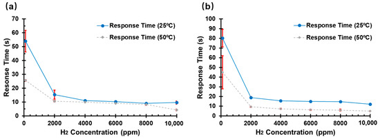 Response time (with standard deviation, sample number (N) = 3) of H2 sensors based on Pd thin film on GOP substrate at various H2 concentrations and temperatures (25 °C and 50 °C): (a) 8 nm and (b) 60 nm.