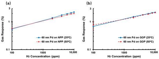 Effect of temperature on gas response for 60 nm Pd on (a) NPP (Reprinted with permission from Ref. [15]. 2022, Springer Nature) and (b) GOP substrates.