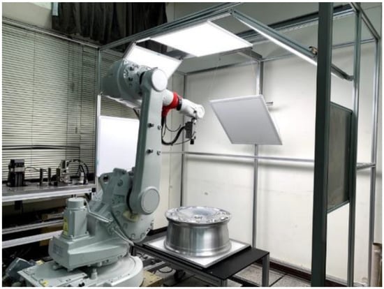 The automated inspection of tire rims is generally performed using X-ray analysis or conventional image processing [1,2,3]. In the current study, we constructed an automated system to detect defects on the forged aluminum rims of electric vehicles, using deep learning and convolutional neural networks [4,5,6,7]. The proposed system adopted the eye-in-hand architecture, which involves a charge-coupled device (CCD) camera on an ABB robotic arm with a graphical user interface to provide control over the camera trajectory and an adjustable light-emitting diode (LED) lighting system. The captured images are then analyzed using an object detection algorithm. We evaluated the YOLO v3 and YOLO v4deep learning models, both of which are lightweight, unsupervised, and efficient. These networks have previously been used to determine whether a mask has been put on correctly [8], to detect surface defects in the equipment in power substations [9], and to detect ships in aerial radar images [10]. The use of deep learning in a system such as this requires a large number of images presenting flaws of every conceivable type; however, obtaining such images can be difficult. In [11], researchers created adversarial networks (DCGAN, LSGAN, and WGAN) to overcome an insufficient number of images for their training model. GANs and DCGANs have been used to establish systems by which to monitor one-dimensional current waveforms [12]. GANs have been used to increase the accuracy of CNNs for the diagnosis of bladder cancer [13]. DCGANs have been used to expand the dataset of chest X-ray images to enhance classifier performance [14].