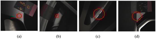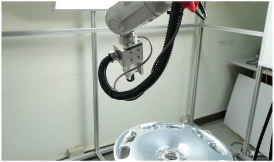 The workpiece in the current study was forged aluminum wheel rims (see Figure 2a), a numerical rendering of which is presented in Figure 2b. Forged aluminum wheel rims are subject to a wide range of defects, including dirt spots, paint stains, scratches, and dents, respectively presented in Figure 3a–d.