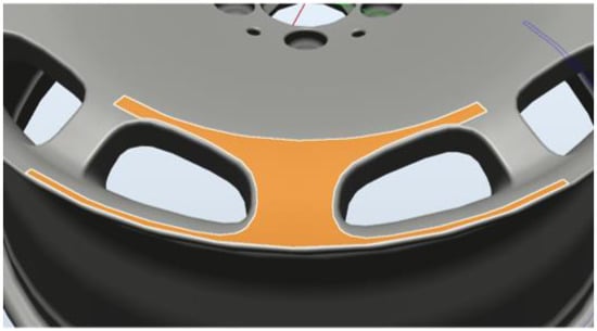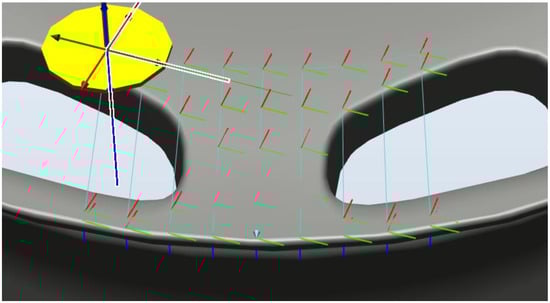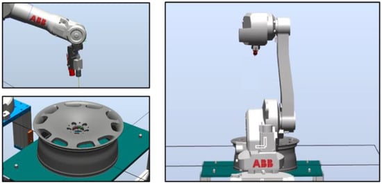 In the following, we outline the methods used to plan the path of the robot arm. In RobotStudio, we first constructed an operating environment, including CAD files of the arm, industrial camera, and wheel rims (see Figure 4). We then created a coordinate map of the tools (camera) and workpiece (wheel rim). We then specified the surface area to be inspected. The resulting generation path was meant to align the camera perpendicular to the surface of interest (see Figure 5). A simulated detection path is presented in Figure 6.