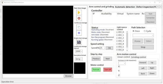 RobotStudio SDK was used to control the robot arm while displaying real-time operating information and scanning results. In addition, external hardware for image recognition, adjusting imaging parameters, and controlling the multi-angle light source was integrated within the robot arm. Figure 7 presents the basic control interface, Figure 8 presents the automation interface, and Figure 9 presents the test results interface.
