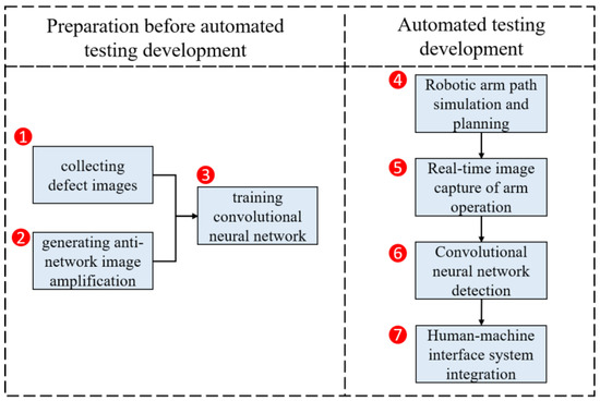 Our objective in this research was to automate the optical detection of defects in forged wheel rims. Experiments were designed to address (1) the collection of images showing examples of defects, (2) the methods used to expand the training dataset, (3) training of the convolutional neural network, (4) planning and simulation of the robot path, (5) capturing real-time images as the robot arm is moving, (6) algorithmic image analysis, and (7) the human-machine interface. A flowchart of the various experiments is presented in Figure 10.