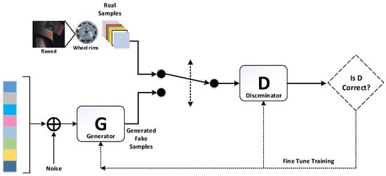 Our use of machine learning for the detection of defects requires a large amount of training data corresponding to defects in the real world. However, it is not easy to collect a large number of instances of a given type of defect or to deal with wheels presenting multiple defects. In the current study, we sought to overcome this limitation by generating additional samples using both GAN and DCGAN. In 2016, Radford et al. [17] proposed a DCGAN system in which convolutional neural networks are used for discriminators and generators. Compared to the original GAN, DCGAN provides superior stability, ease of convergence, and image samples of superior quality. The architecture of DCGAN is comparable to that of GAN; however, both the generator and the discriminator use convolutional neural networks. In each convolutional layer, batch regularization is applied to the generator and discriminator to enhance stability.