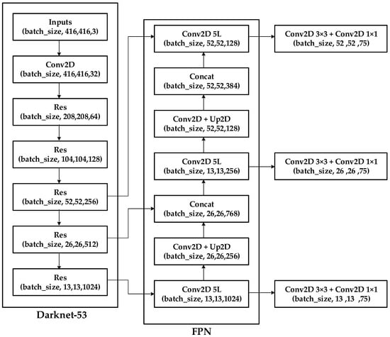 YOLO v3 employs the feature pyramid network (FPN) architecture, which uses multi-scale feature mapping to facilitate the detection of objects. For example, a 416 × 416 image might undergo downsampling 32 times, 16 times, and eight times to obtain feature maps at three different scales. Figure 12 illustrates the architecture of YOLO v3 [21].