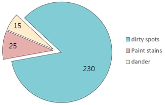 Most of the rims used in this study had dirt spots and/or paint stains. From these actual rims, we collected 245 images of defects. We compiled a total of 270 defects, including 230 dirt spots, 25 paint stains, and 15 dander defects. Figure 15 illustrates the distribution of defect types as percentages. Figure 16 presents examples of the three types of defects.