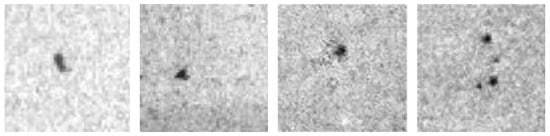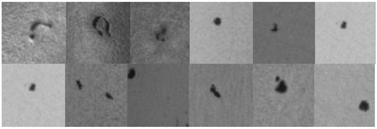 When the 2448 × 2048 image is directly input to the neural network, the output will not highlight the characteristics of the flaw. First, we use the image processing software to crop the flawed images to a size of 64 × 64, as shown in Figure 18 below. Then, the 270 pieces of 64 × 64 flaw images are stored in the dataset.