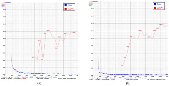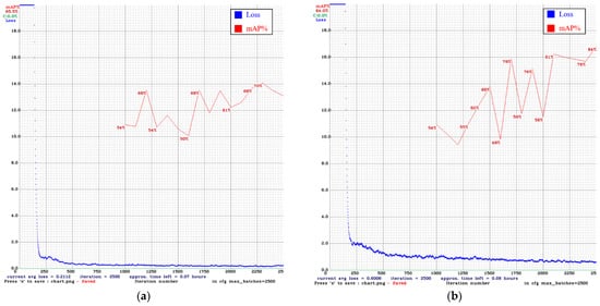 In Figure 24 and Figure 25, the blue line is the loss curve, and the red line is the mAP. In our comparison of models after 2500 iterations, the mAP of YOLO v3 using only the original images was 53.0%. Adding DCGAN images increased the mAP to 67.1%. The mAP of YOLO v4 using only the original images was 65.5%. Adding DCGAN images increased the mAP to 84.0%. Overall, YOLO v4 outperformed YOLO v3, and the inclusion of synthetic images further improved performance.